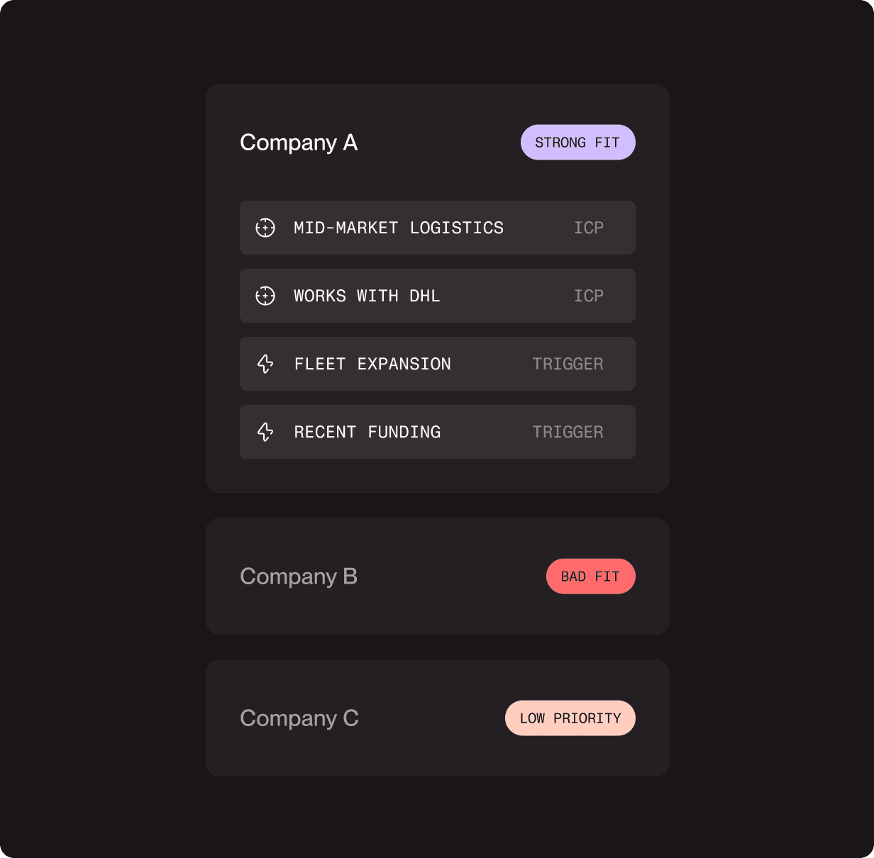 We evaluate each business using public signals like partnerships, hiring trends, site content, strategic positioning as well as completely proprietary signals created just for you